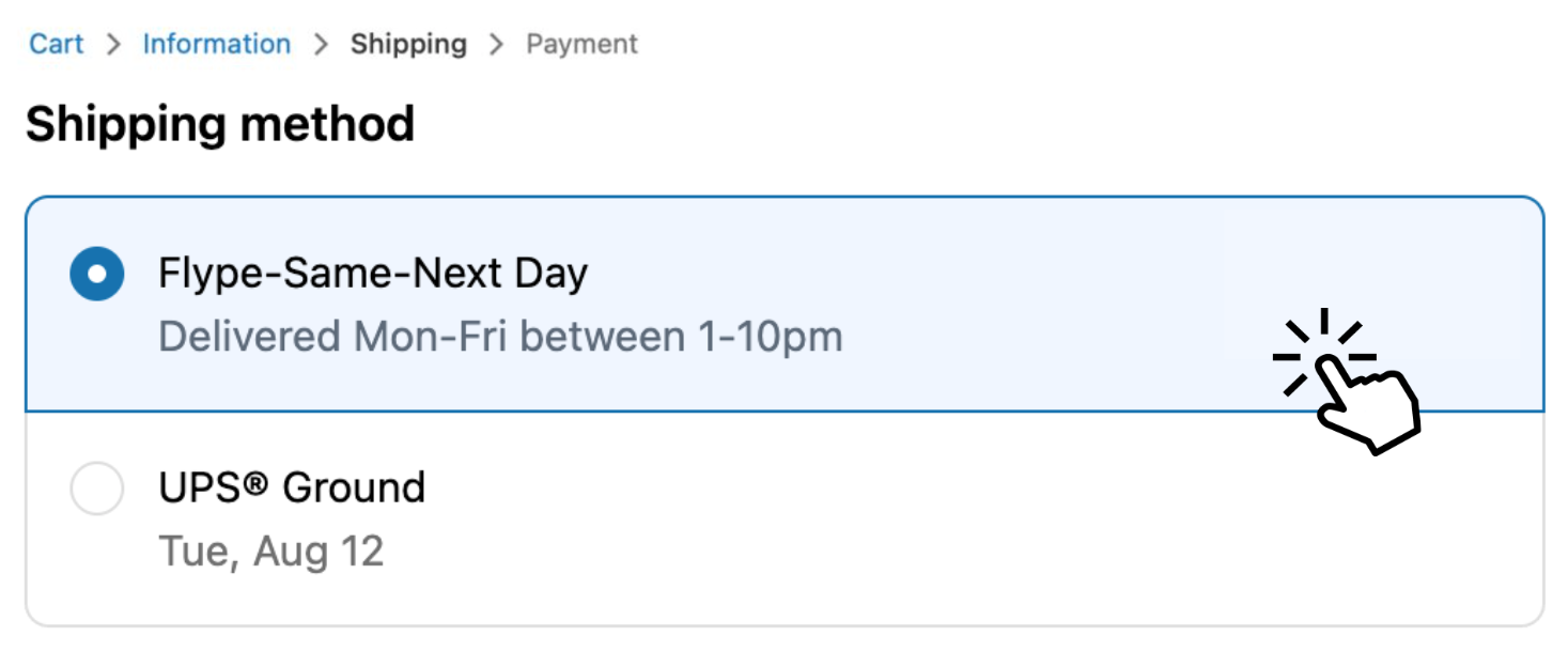 Seamlessly integrate Flype with your e-commerce platform, via Shopify and more. Flype appears as the fastest, most affordable shipping option. Orders placed through Flype are automatically synced with our system, no extra setup required.
